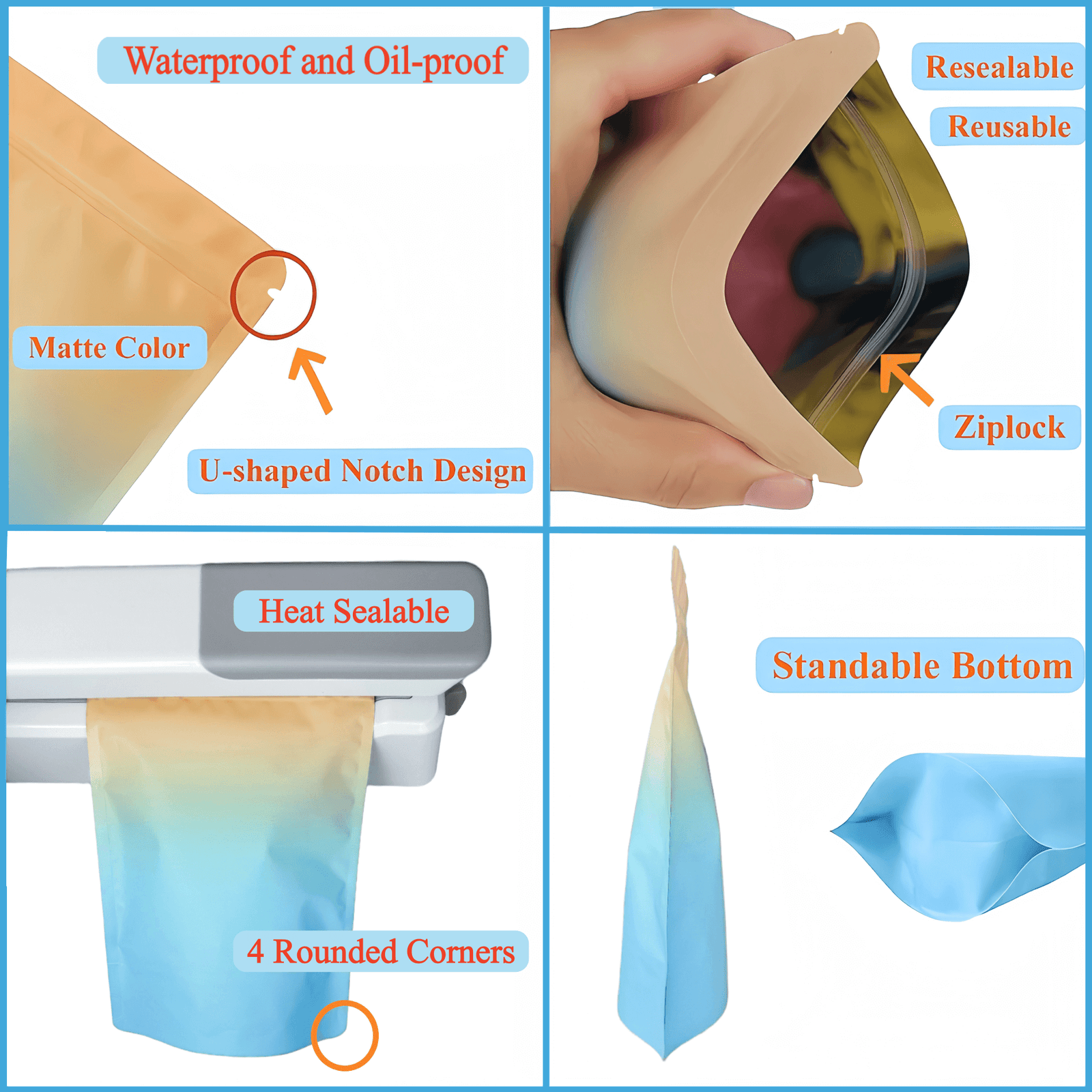 Grâce à leur épaisseur renforcée, ces pochettes stand-up offrent une excellente résistance à l’usure, aux frottements et aux déchirures. Contrairement aux sachets plastiques ordinaires, elles sont beaucoup plus robustes et assurent une meilleure longévité, même en cas d’usage répété.
