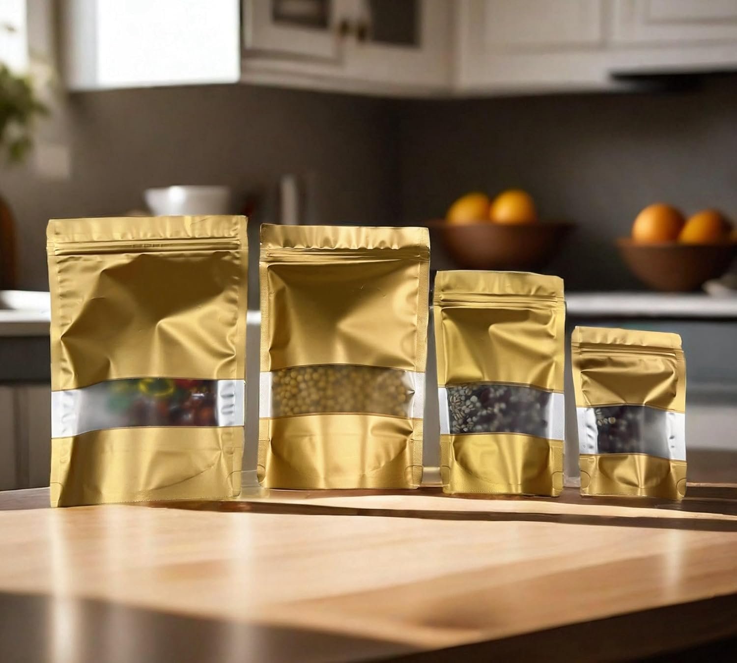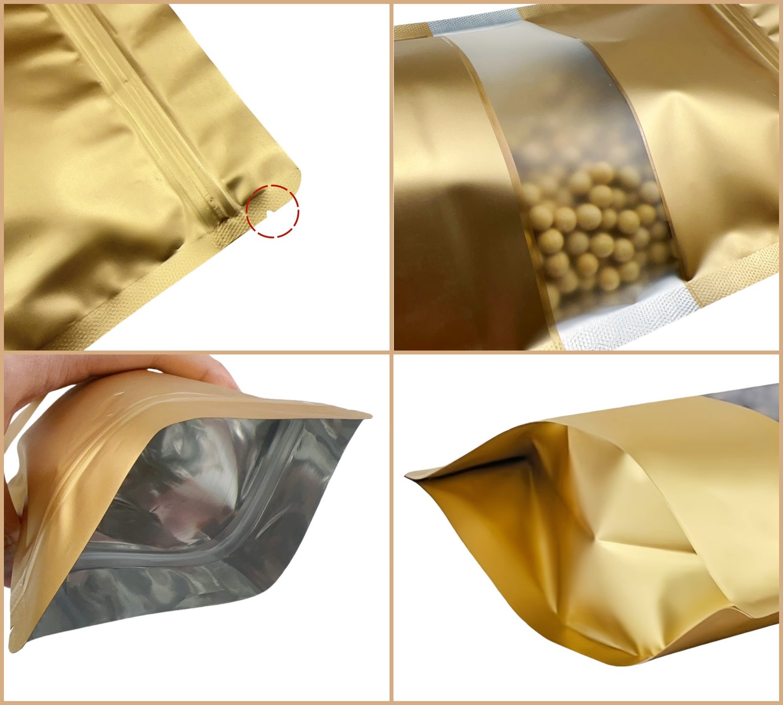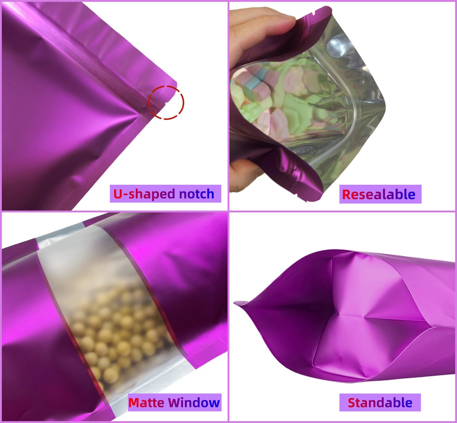 Nos sachets zip doypack aluminium sont conçus avec des matériaux alimentaires (mylar et aluminium), reconnus pour leur fiabilité et leur sécurité d’utilisation. Elles sont sans BPA, inodores et respectueuses de l’environnement, ce qui en fait une solution idéale pour l’emballage alimentaire ou le stockage de produits sensibles.