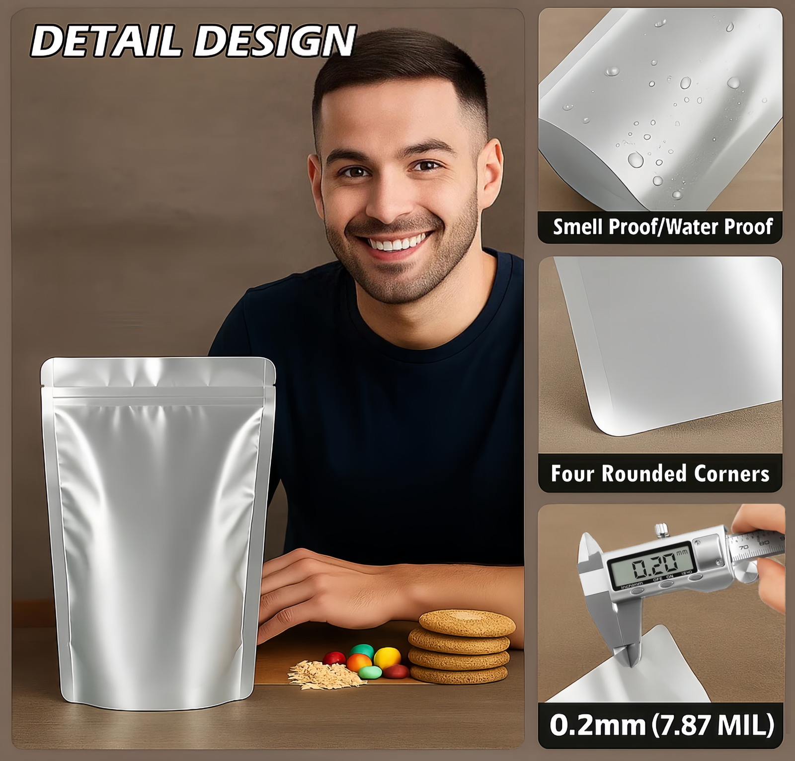 Nos sachets doypack aluminium sont conçus avec des matériaux alimentaires sûrs, notamment l’aluminium, reconnus pour leur fiabilité et leur sécurité d’utilisation. Les pochettes zip sont sans BPA, inodores et respectueuses de l’environnement, ce qui en fait une solution idéale pour l’emballage alimentaire ou le stockage de produits sensibles.