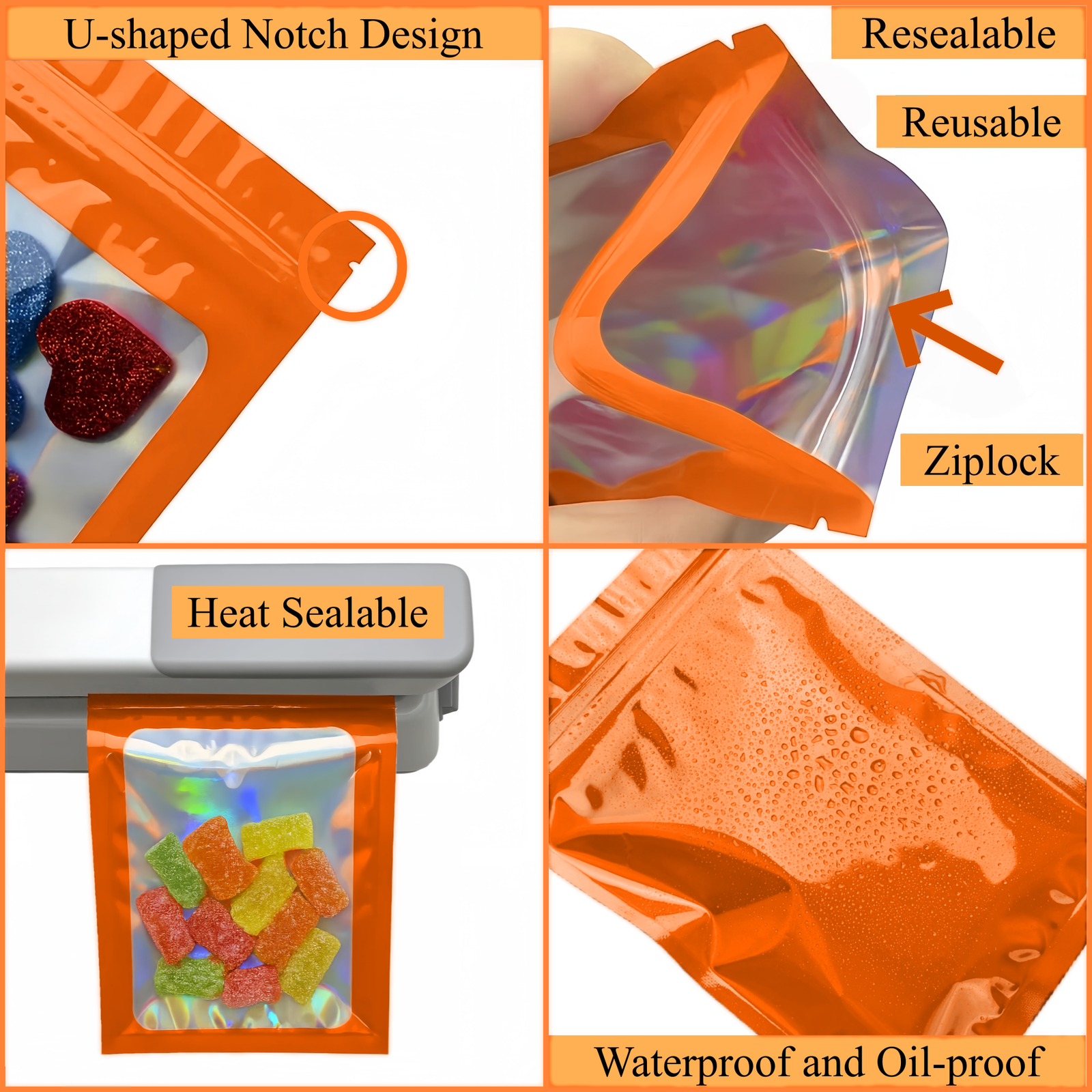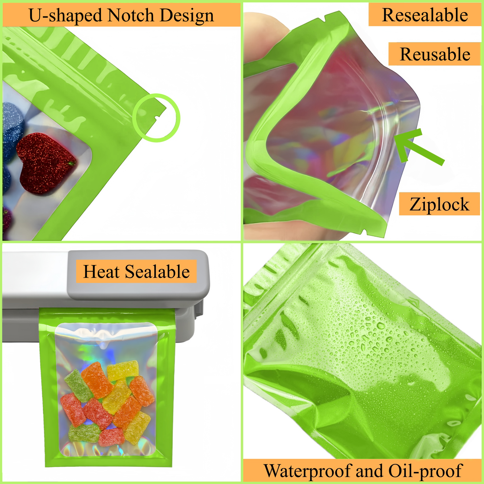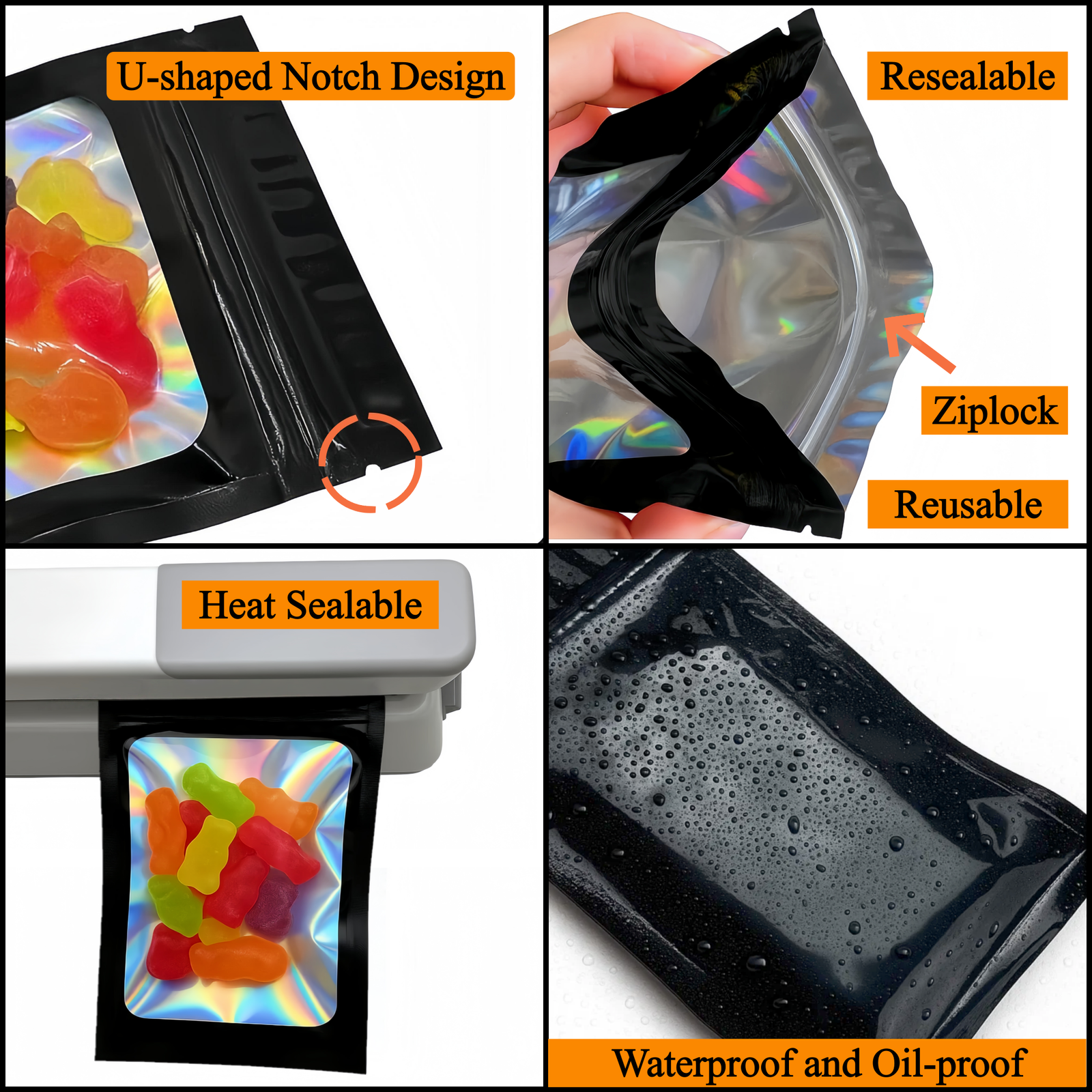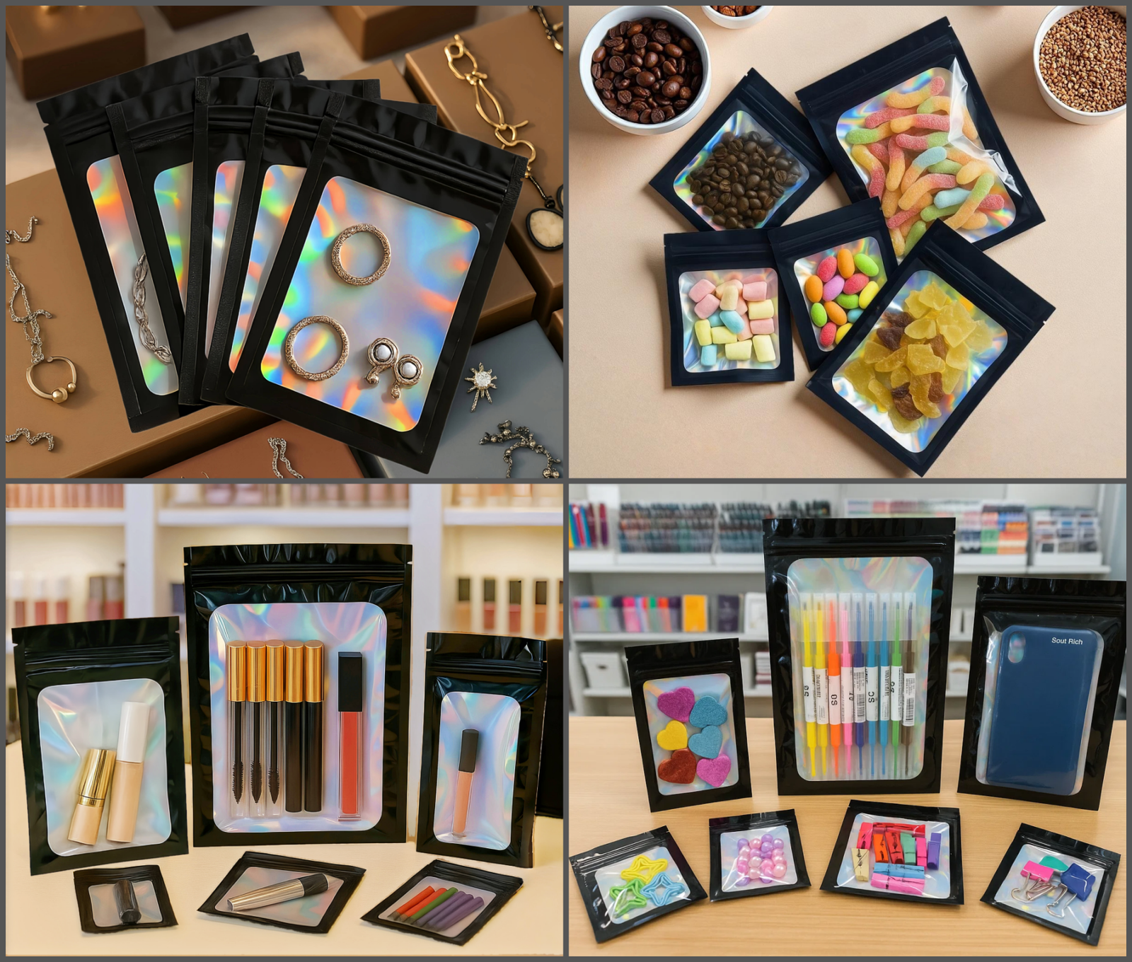 Nos sachets zip holographiques sont fabriqués à partir de matériaux de qualité alimentaire, notamment l’aluminium et le mylar, reconnus pour leur fiabilité et leur sécurité d’utilisation. Elles sont sans BPA, inodores et respectueuses de l’environnement, ce qui en fait une solution idéale pour l’emballage alimentaire ou le stockage de produits sensibles.