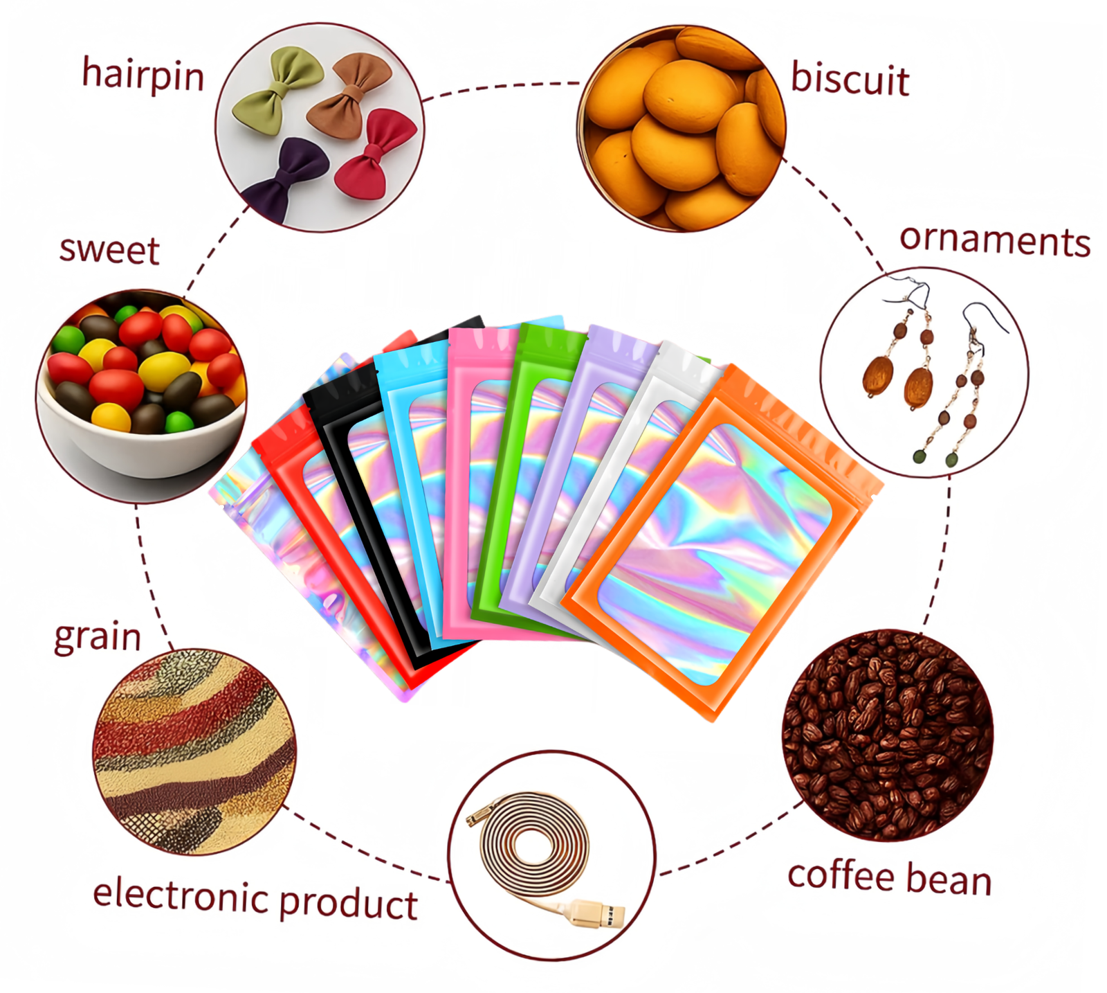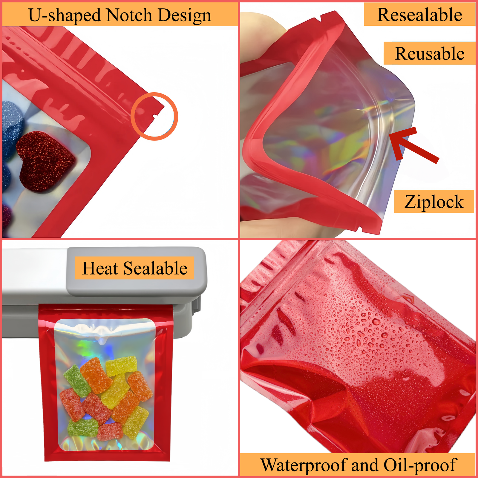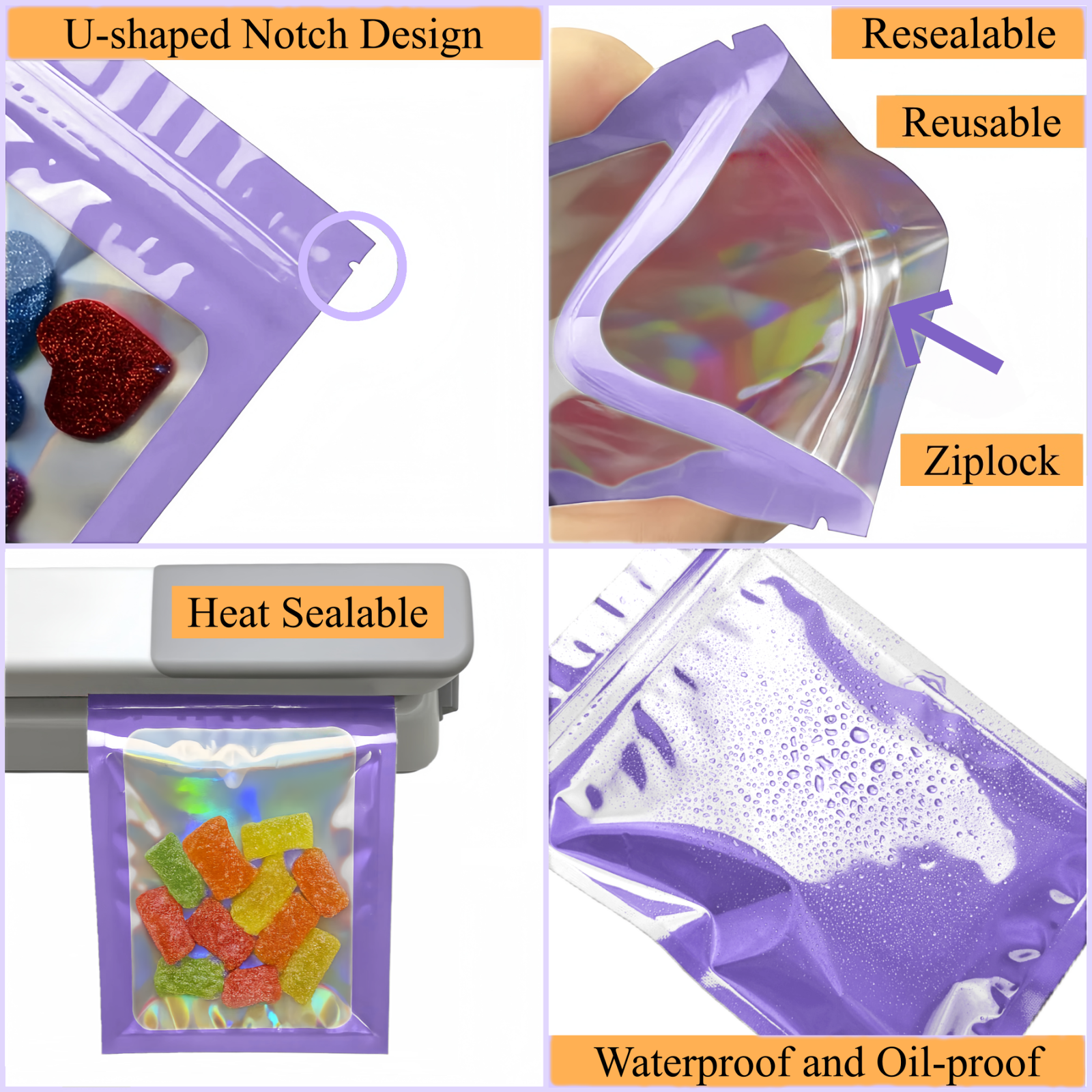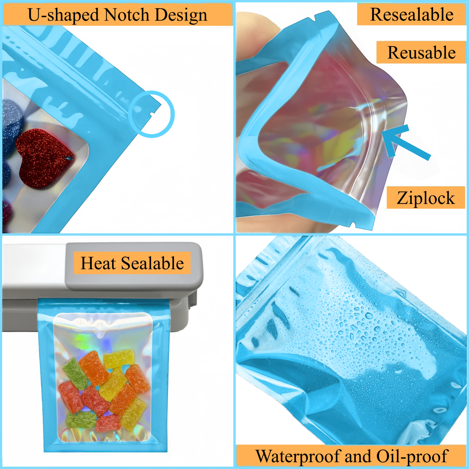Nos sachets zip holographiques sont fabriqués à partir de matériaux de qualité alimentaire, notamment l’aluminium et le mylar, reconnus pour leur fiabilité et leur sécurité d’utilisation. Elles sont sans BPA, inodores et respectueuses de l’environnement, ce qui en fait une solution idéale pour l’emballage alimentaire ou le stockage de produits sensibles.