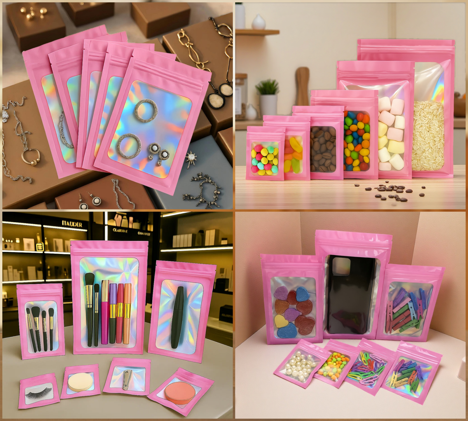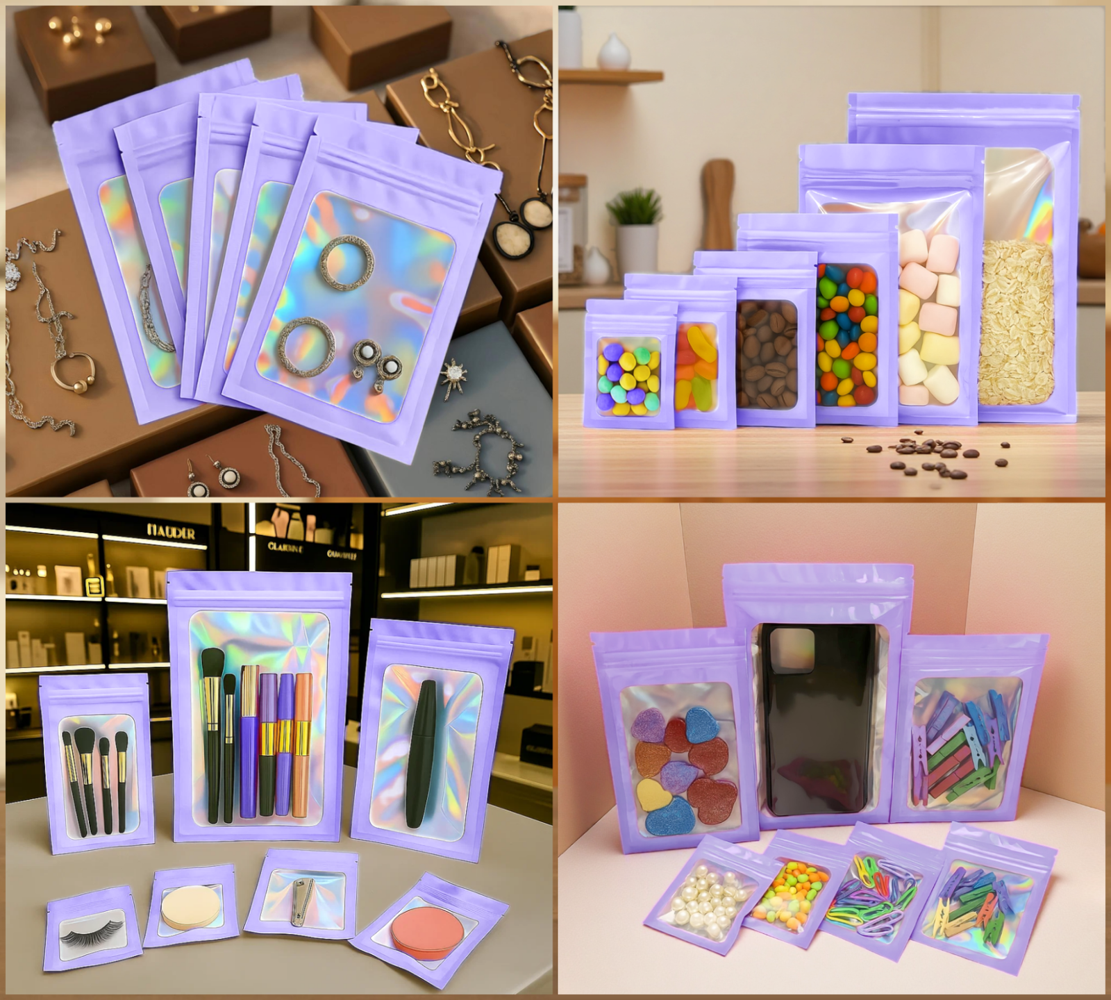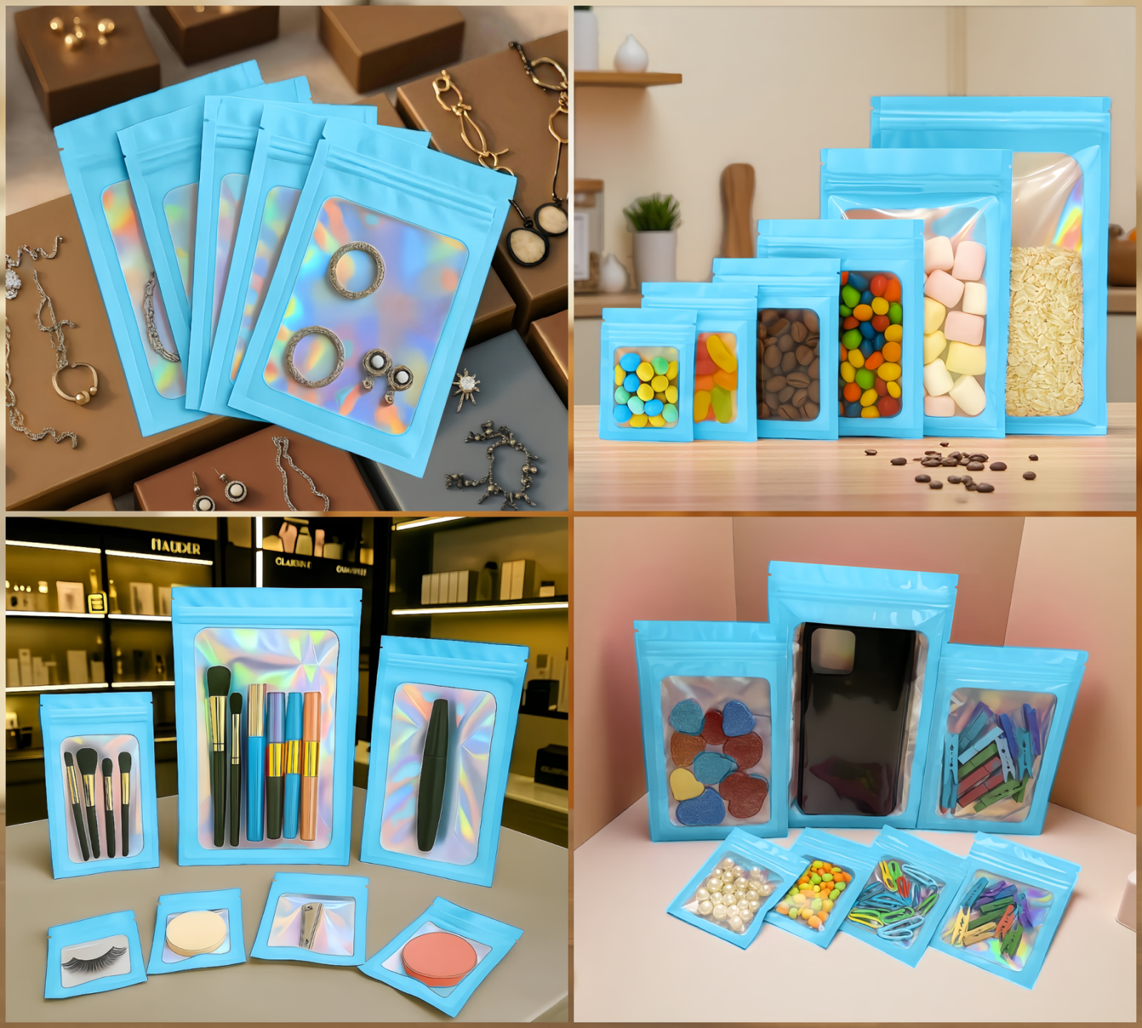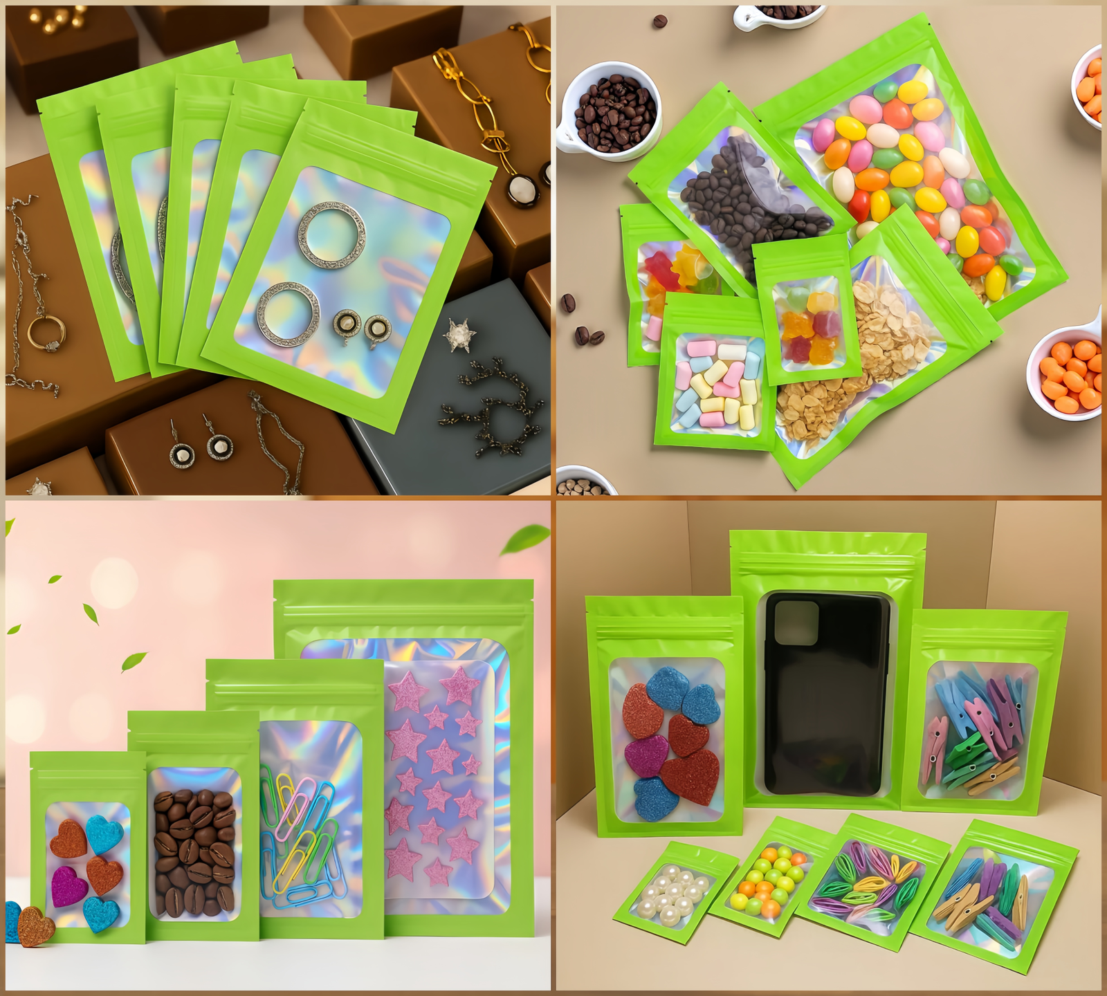 Ces sachets zip réutilisables sont très pratiques. Vous pouvez les utiliser pour conserver du café, du thé, des bonbons, des épices et des échantillons. Ils conviennent aussi aux fruits secs, céréales et croquettes. De plus, ils sont utiles pour stocker des bijoux, accessoires, ou coques de téléphone. Enfin, ils permettent d’organiser des échantillons, produits de beauté ou objets de voyage.