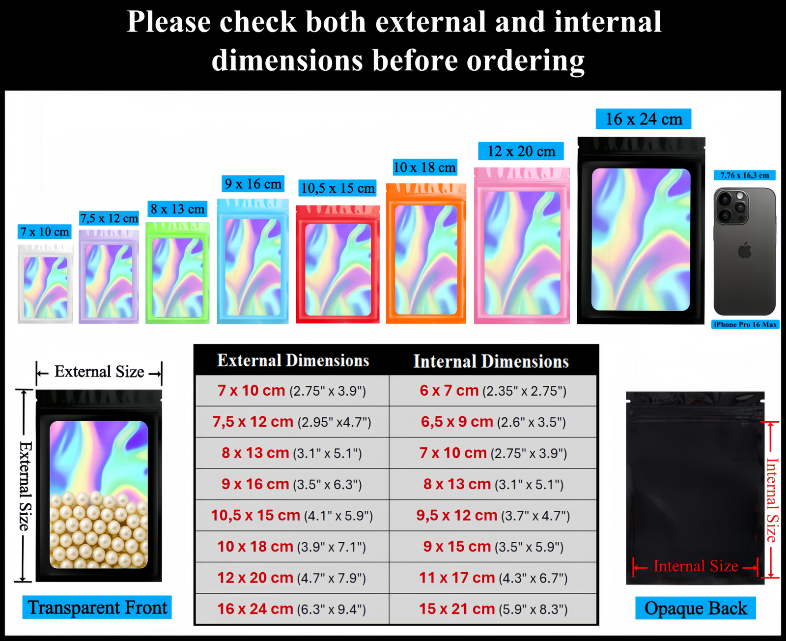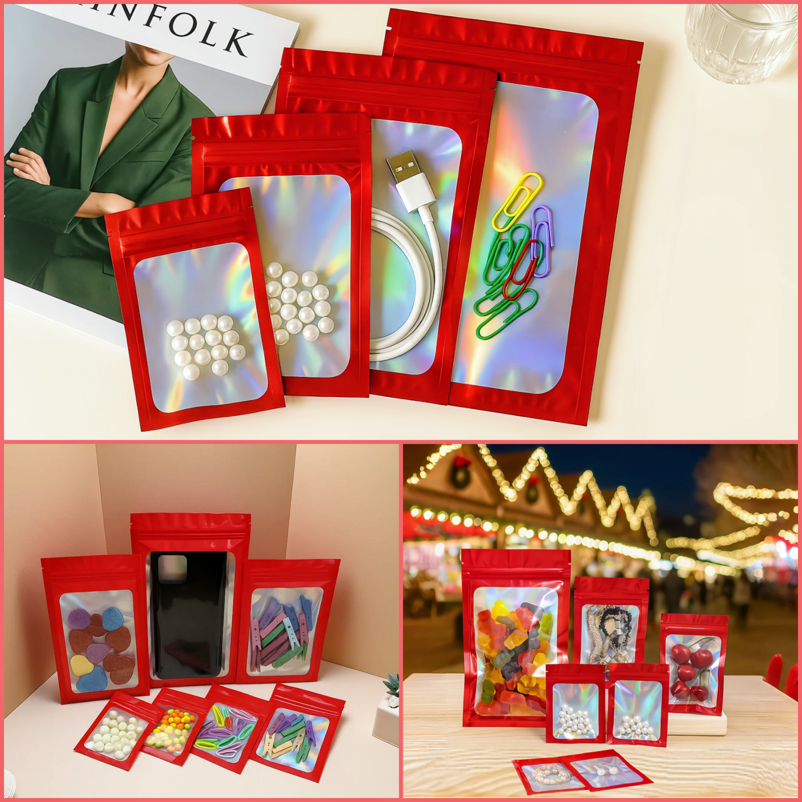Avec son effet arc-en-ciel brillant, ces pochettes attirent l’œil et apportent une touche élégante. Leur face transparente permet de visualiser le contenu sans les ouvrir. Réutilisables et refermables, elles se lavent facilement pour un usage prolongé.
