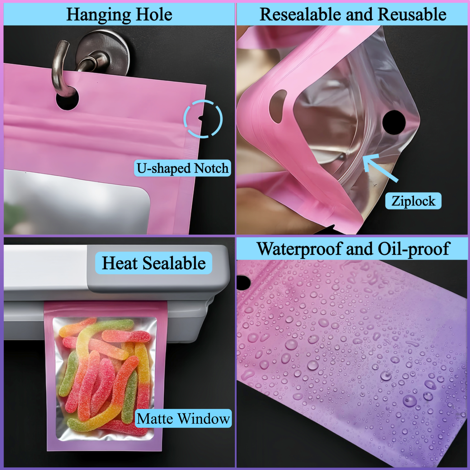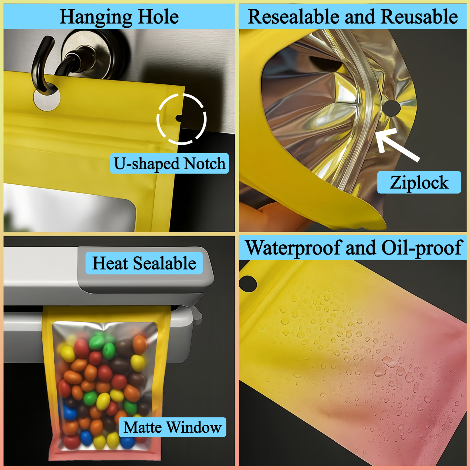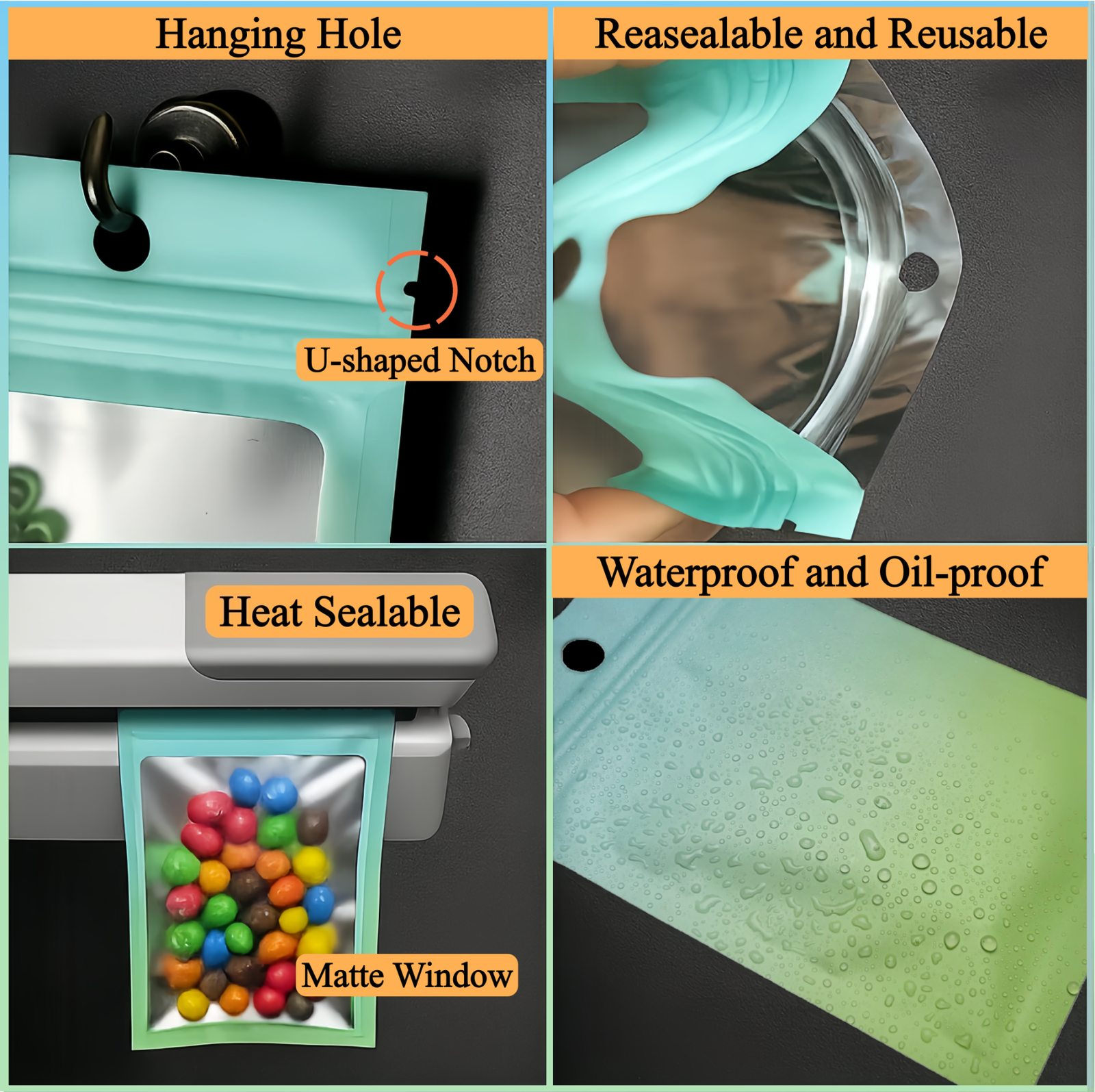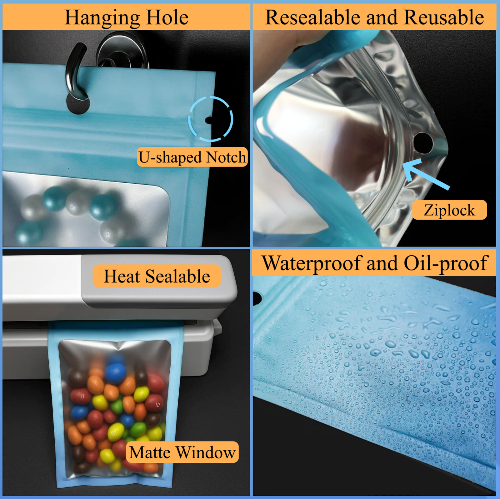 Nos sachets zip avec fenêtre sont fabriqués à partir de matériaux de qualité alimentaire, notamment l’aluminium et le mylar, reconnus pour leur fiabilité et leur sécurité d’utilisation. Elles sont sans BPA, inodores et respectueuses de l’environnement, ce qui en fait une solution idéale pour l’emballage alimentaire ou le stockage de produits sensibles.
