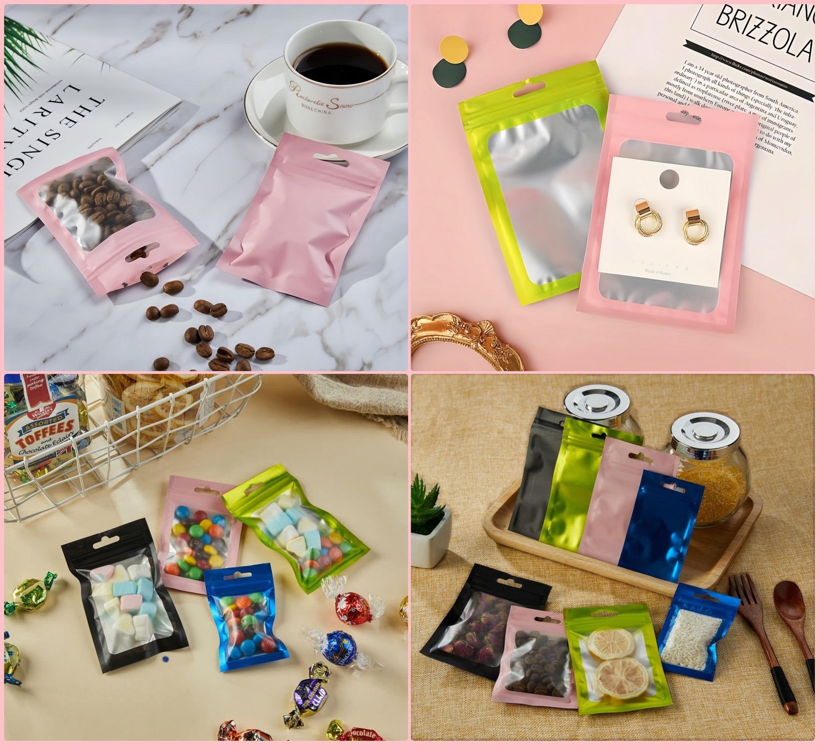 Ces sacs à fermeture zip sont très pratiques. Vous pouvez les utiliser pour conserver du café, du thé, des bonbons, des épices et des échantillons. Ils conviennent aussi aux fruits secs, céréales et croquettes. De plus, ils sont utiles pour stocker des bijoux, accessoires, ou coques de téléphone. Enfin, ils permettent d’organiser des échantillons, produits de beauté ou objets de voyage.
