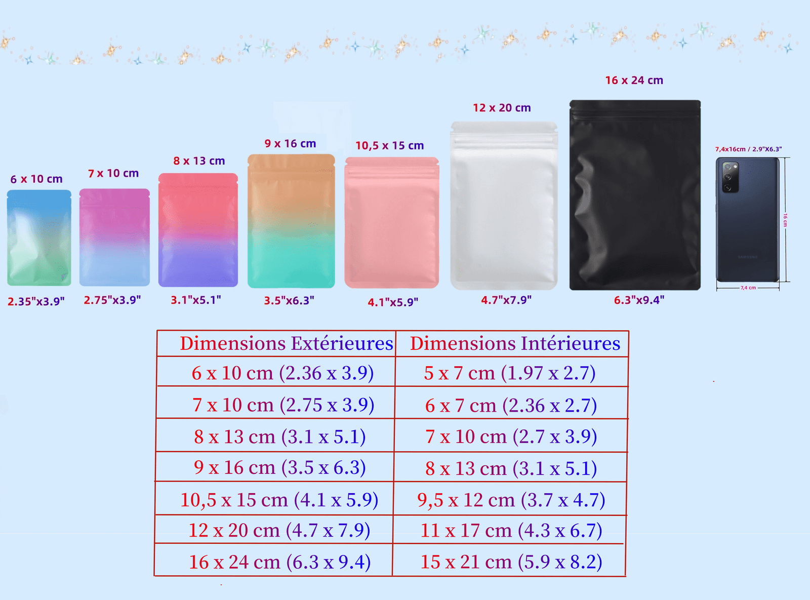 Nous proposons des sachets mylar disponibles en plusieurs couleurs et tailles, afin de répondre à tous vos besoins spécifiques.
