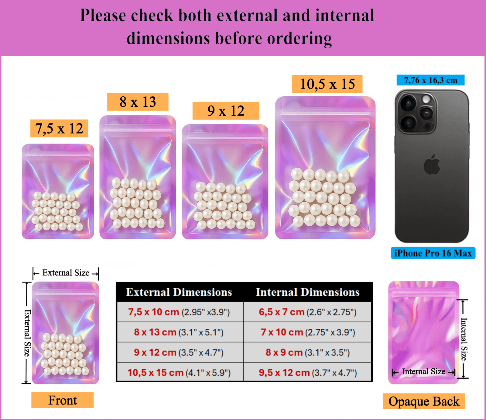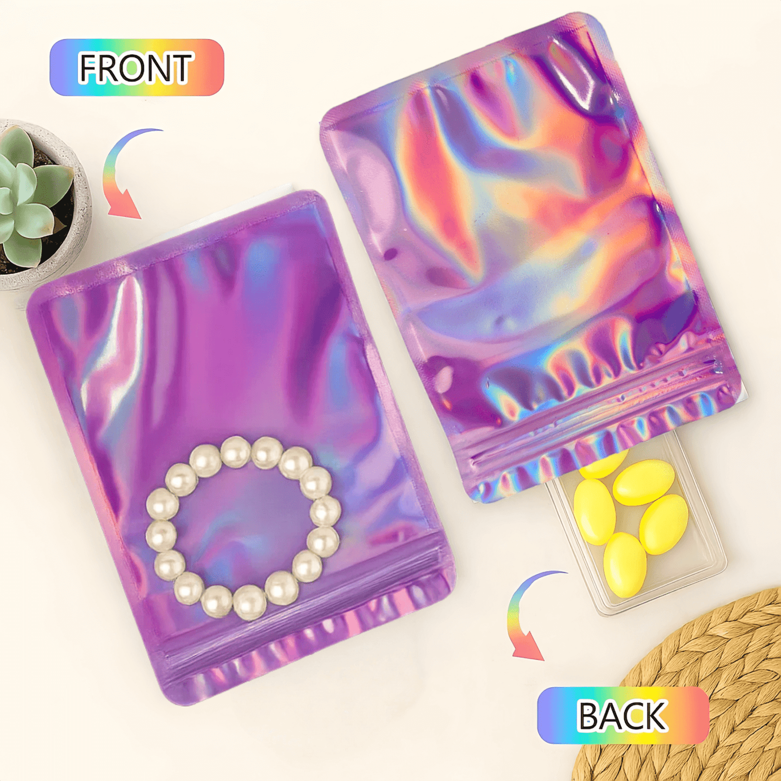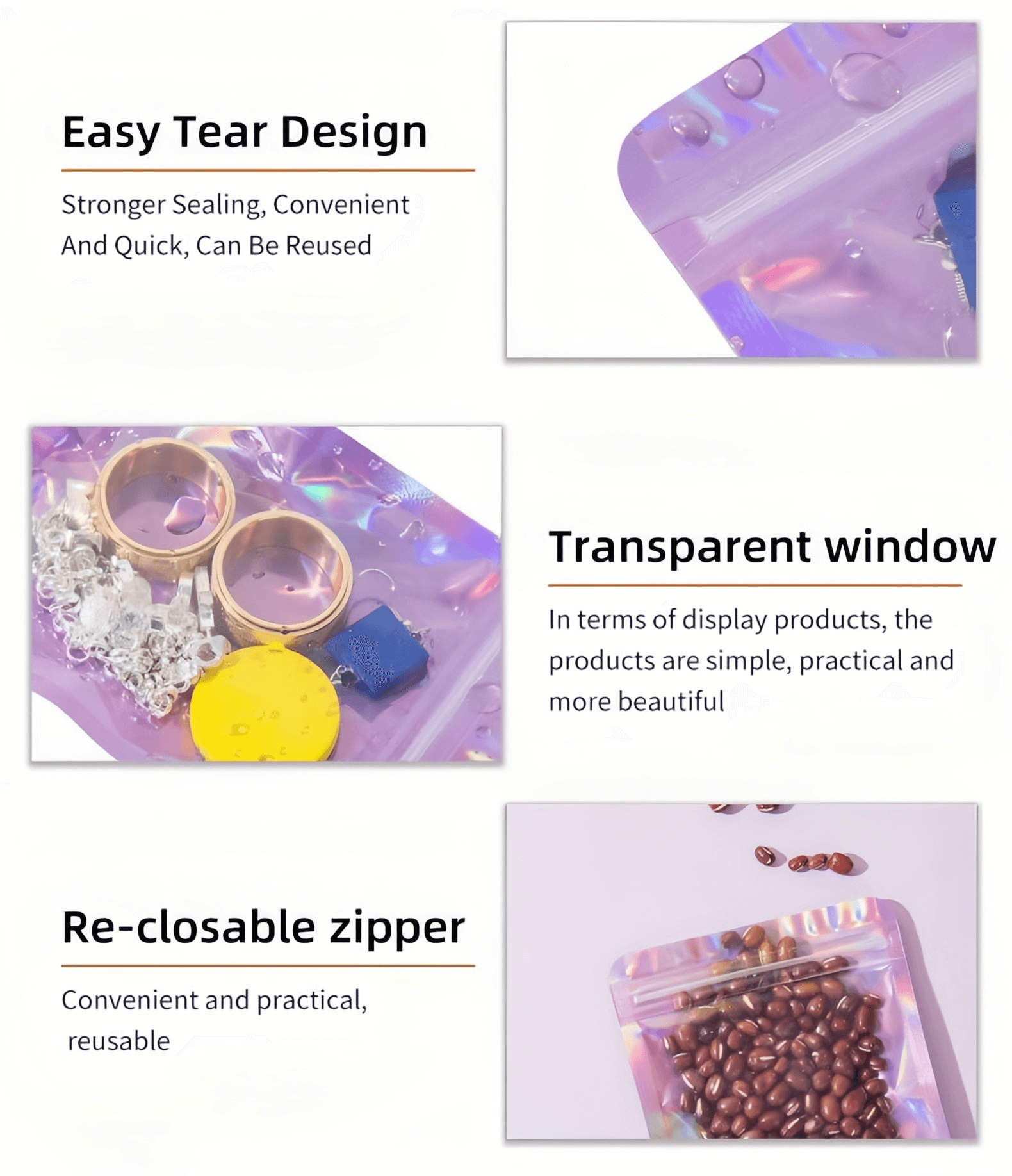 Le côté holographique rose de ces sachets est magnifique, offrant un éclat arc-en-ciel. En revanche, l’autre côté transparent permet de voir facilement le contenu sans avoir à ouvrir le sachet. Ainsi, il est non seulement esthétique, mais aussi pratique. De plus, la pochette est refermable et réutilisable après un simple lavage, ce qui la rend parfaite pour ranger et classifier toutes sortes d’articles.